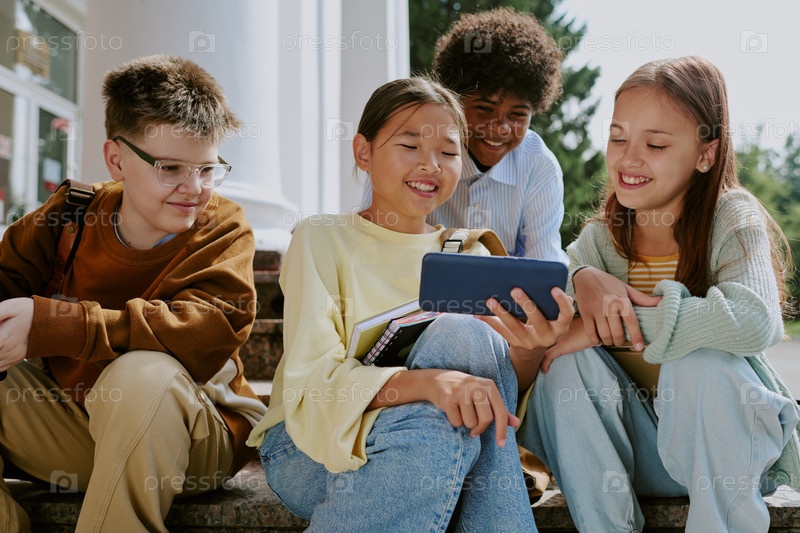 Группа разнообразных подростков, сидящих на улице и смотрящих видео со смартфона вместе