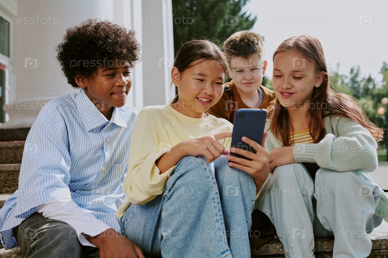Мультиэтническая группа подростков, сидящих на улице с помощью смартфона вместе