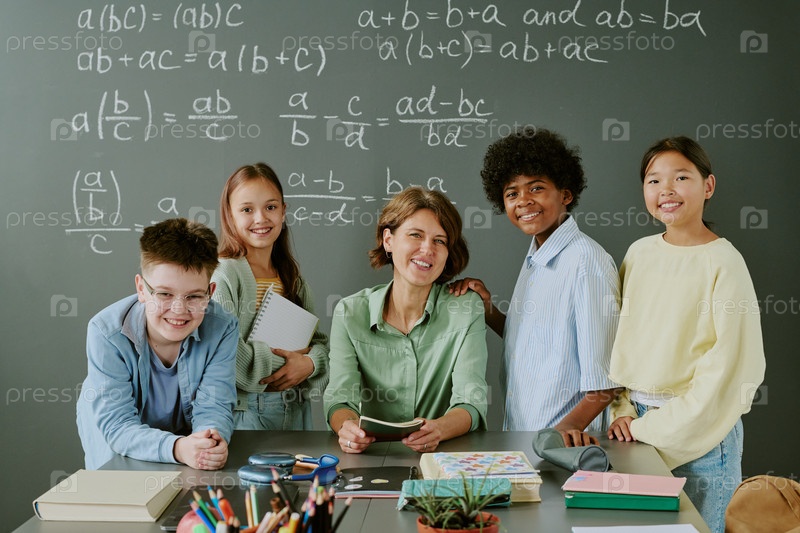 Учительница сидит с разнообразной группой улыбающихся школьников