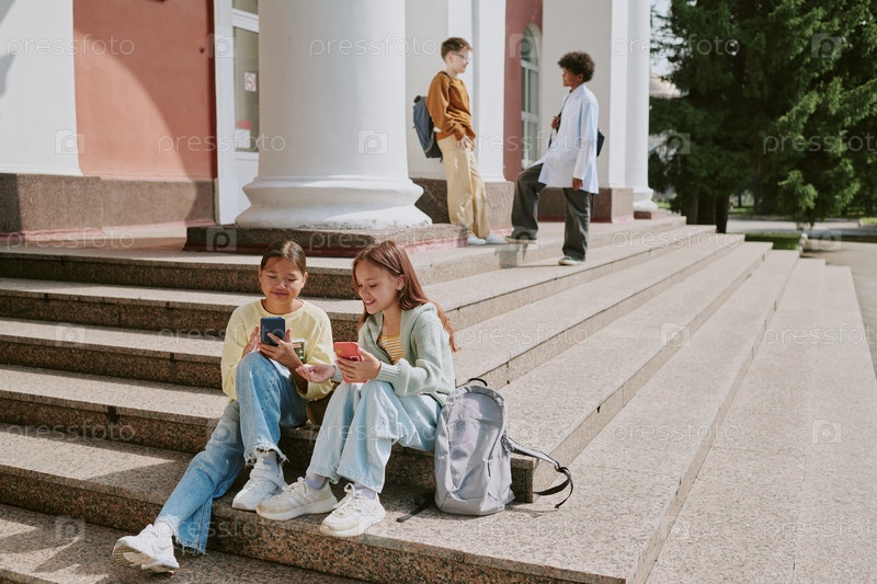 Подростки сидят на ступеньках с помощью смартфонов, в то время как мальчики разговаривают поблизости