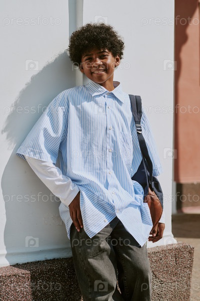 Портрет чернокожего мальчика-подростка, улыбающегося, прислонившись к наружной стене