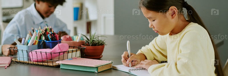 Азиатская девочка пишет в блокноте, а чернокожий мальчик рисует в классной обстановке