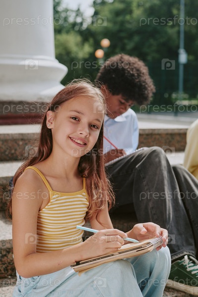 Портрет девушки, улыбающейся во время рисования на открытом воздухе с подростком, который учится
