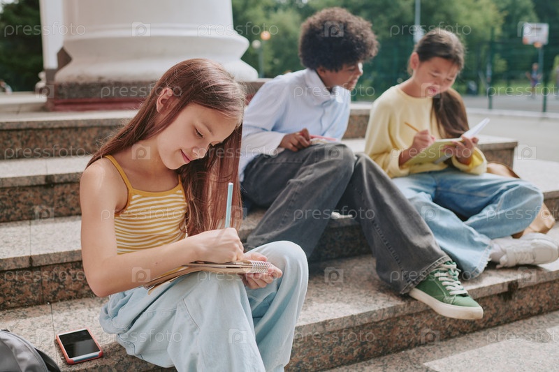 Подростки и мальчики сидят на улице, вместе пишут в тетради