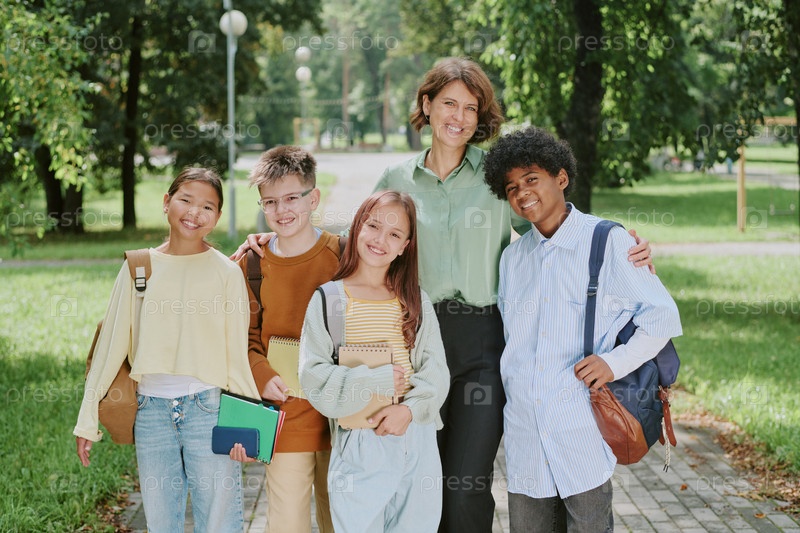 Мультиэтническая группа учеников в возрасте до 19 лет, стоящих с учительницей на открытом воздухе