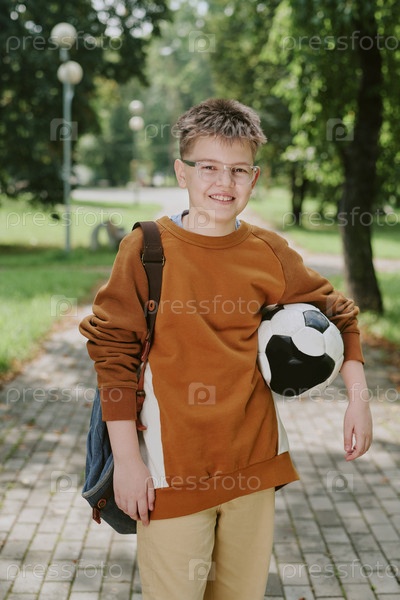 Портрет мальчика, улыбающегося и держащего футбольный мяч на открытом воздухе