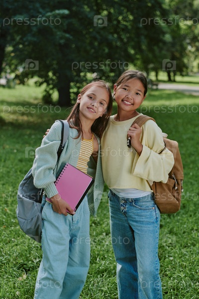 Две девочки-подростки улыбаются и обнимаются на улице в парке, неся с собой рюкзаки