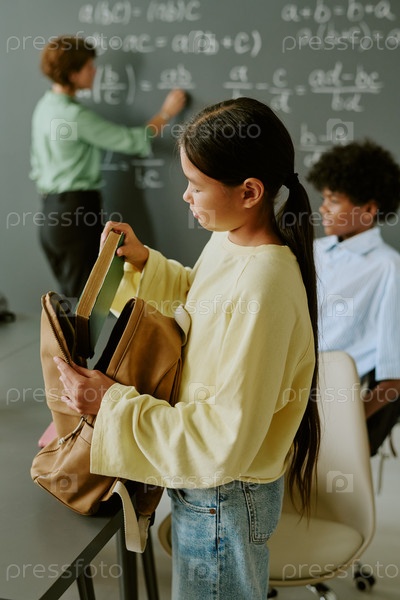 Азиатская девочка-подросток собирает рюкзак, в то время как учительница пишет на доске