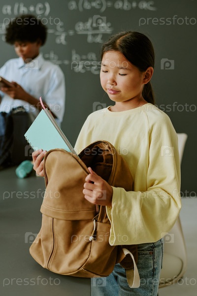 Азиатская девочка-подросток распаковывает рюкзак в классе с одноклассницей, которая учится