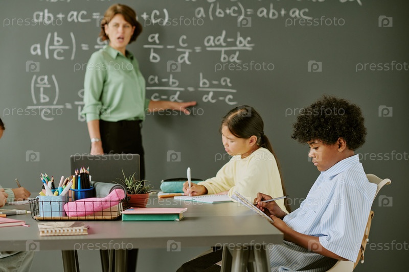 Женщина среднего возраста учит разных детей решать математические уравнения