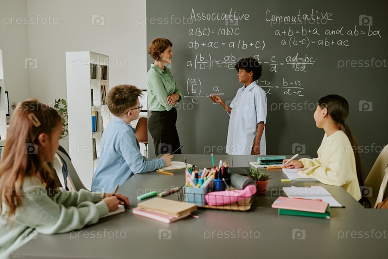 Чернокожий подросток объясняет математическую формулу учителю и разным одноклассникам