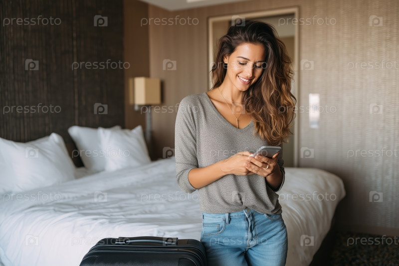 Молодая взрослая женщина улыбается, используя смартфон в гостиничном номере
