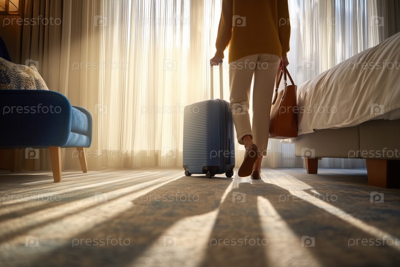 Молодая взрослая женщина ходит с чемоданом, входящей в гостиничный номер