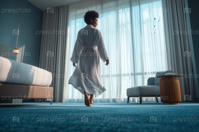 Молодая взрослая чернокожая женщина ходит босиком в современном интерьере гостиничного номера