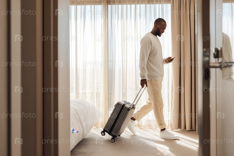 Молодой взрослый чернокожий мужчина ходит в помещении, вытаскивая чемодан при использовании смартфона