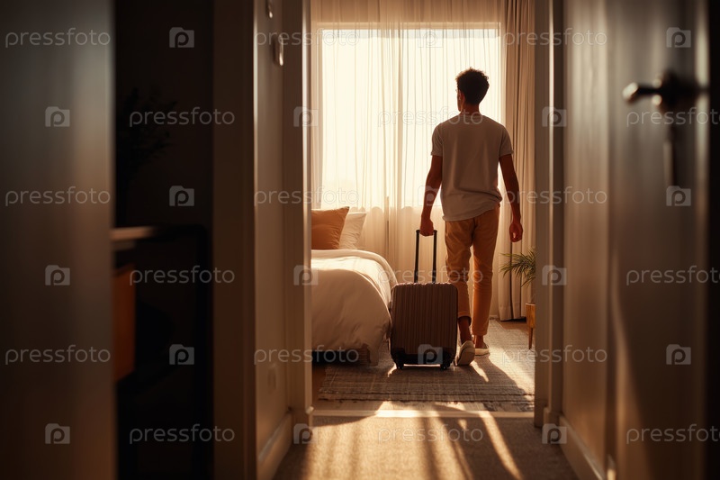 Молодой взрослый мужчина входит в гостиничный номер с чемоданом во время восхода солнца