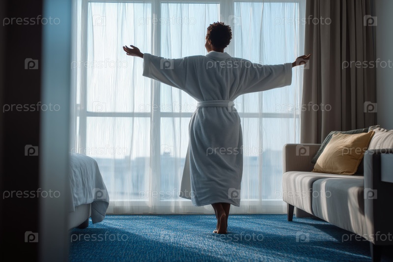 Молодая взрослая чернокожая женщина стоит с распростертыми руками возле окна
