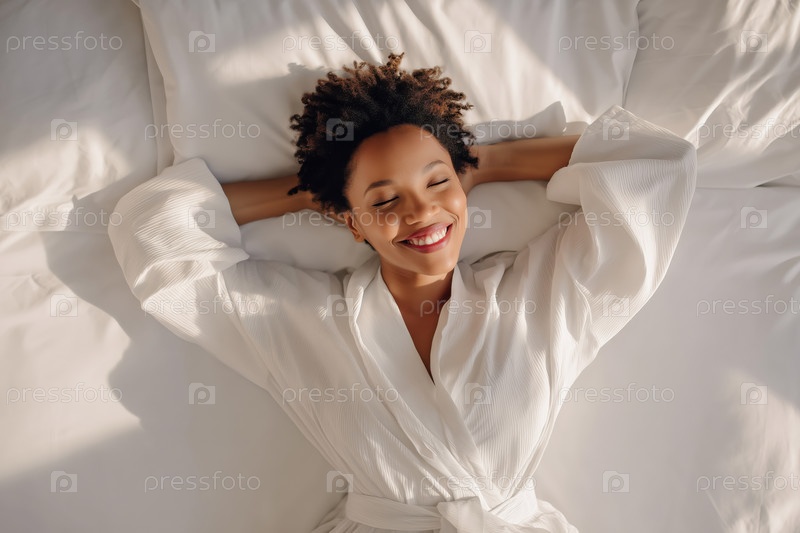 Молодая взрослая чернокожая женщина отдыхает на кровати, улыбаясь с закрытыми глазами