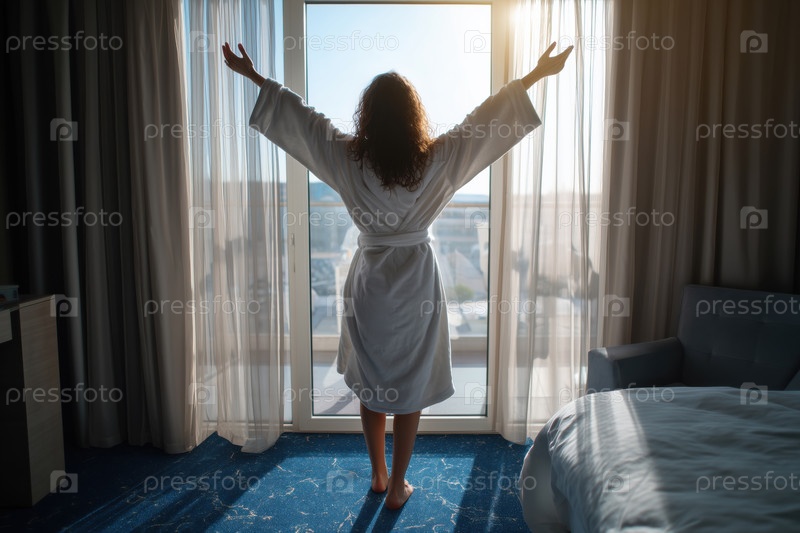 Молодая взрослая женщина стоит у окна, наслаждаясь утренним солнечным светом