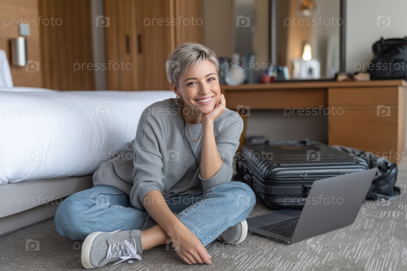 Портрет молодой взрослой женщины, улыбающейся, сидящей рядом с чемоданом