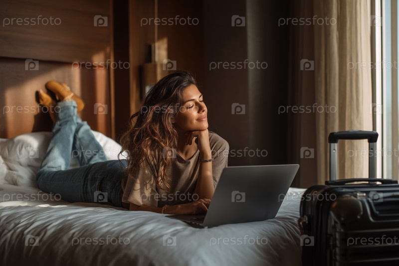 Молодая взрослая женщина отдыхает на кровати с помощью ноутбука в гостиничном номере