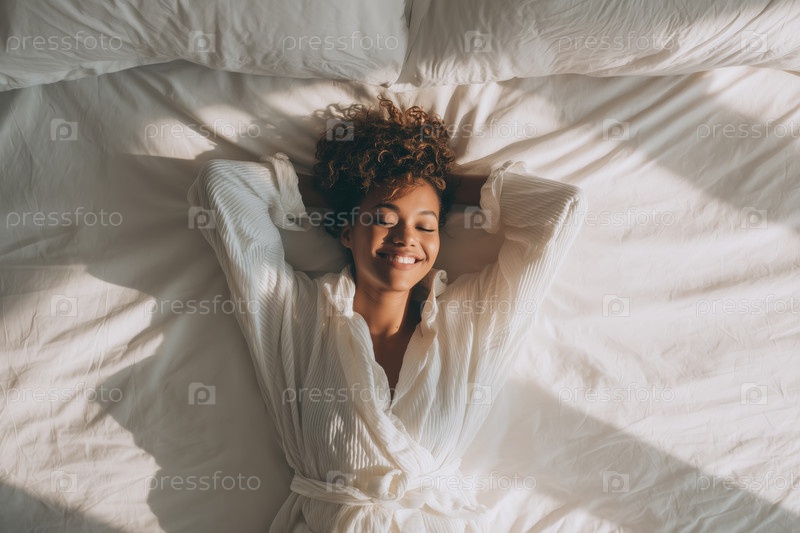 Молодая взрослая чернокожая женщина отдыхает на кровати с закрытыми глазами и улыбается