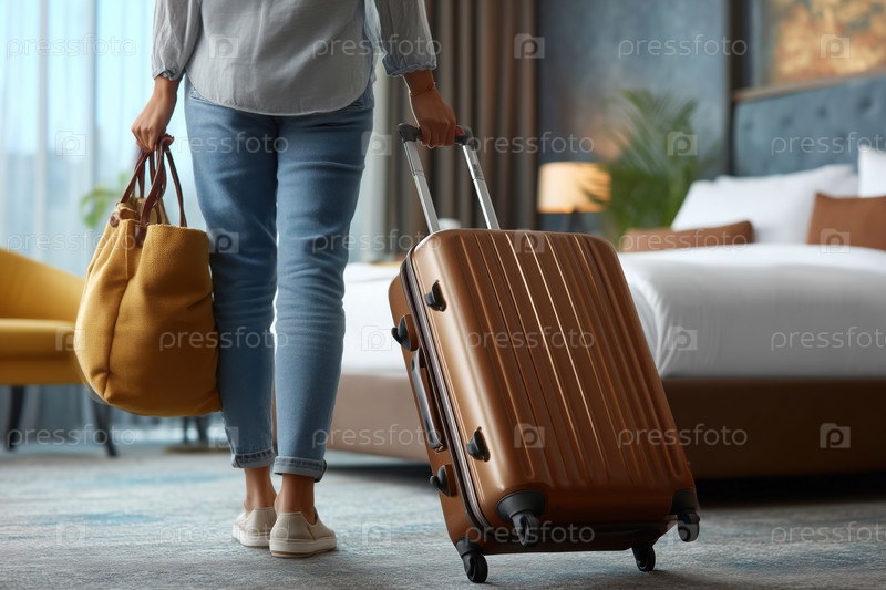 Молодая взрослая женщина входит в гостиничный номер, неся чемодан и сумочку