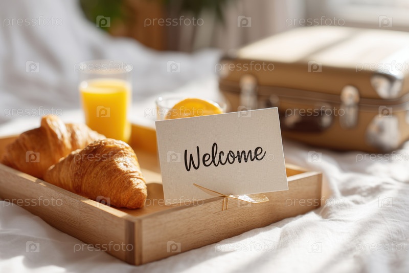 Континентальный завтрак с круасантами и соком, подаваемым на кровати в гостиничном номере