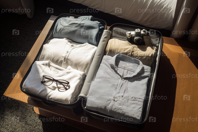 Чемодан и фотоаппарат на деревянном столе в открытом гостиничном номере