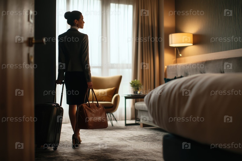 Молодая взрослая женщина входит в гостиничный номер, неся чемодан и сумку