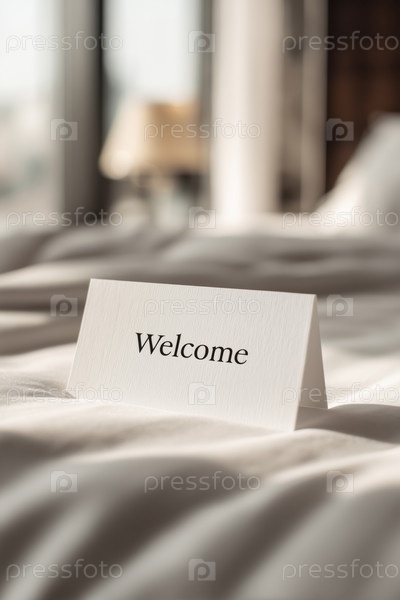 Ближайшее изображение приветственной карточки, помещенной на кровать в солнечном интерьере гостиничного номера