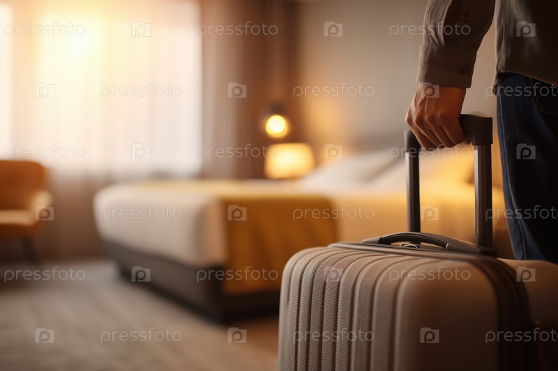 Молодой взрослый мужчина прибывает в гостиничный номер, держит чемодан с ручкой