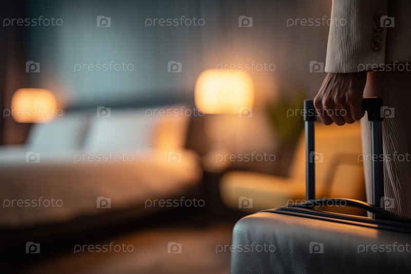 Молодая взрослая женщина прибывает в гостиничный номер с чемоданом вечером