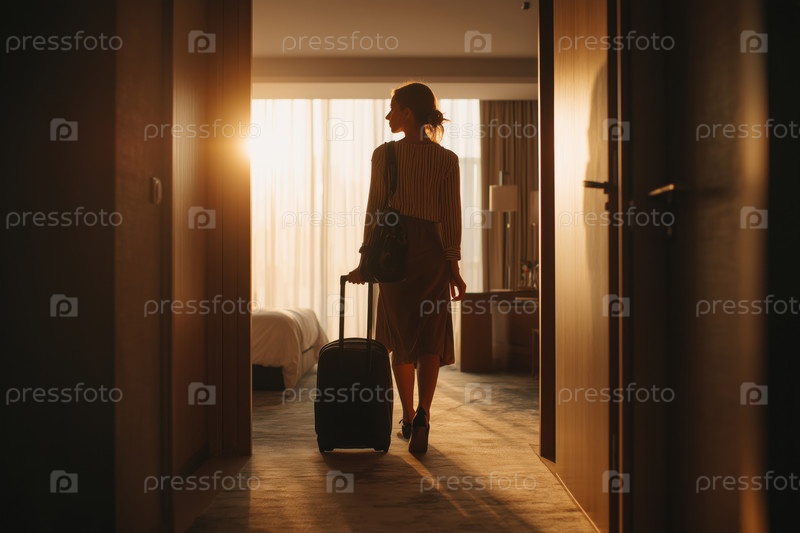 Молодая взрослая женщина входит в гостиничный номер с чемоданом во время захода солнца