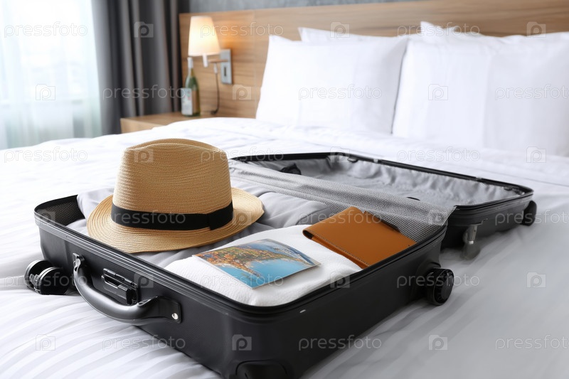 Чемодан с соломенной шляпой и паспортом, лежащий на открытой гостиничной кровати в номере