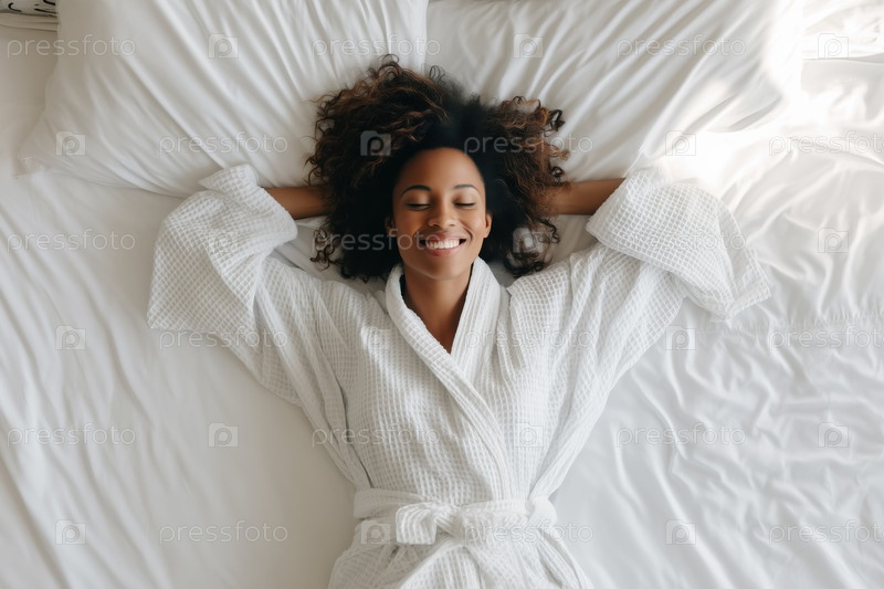 Молодая взрослая черная женщина отдыхает на кровати и улыбается с закрытыми глазами