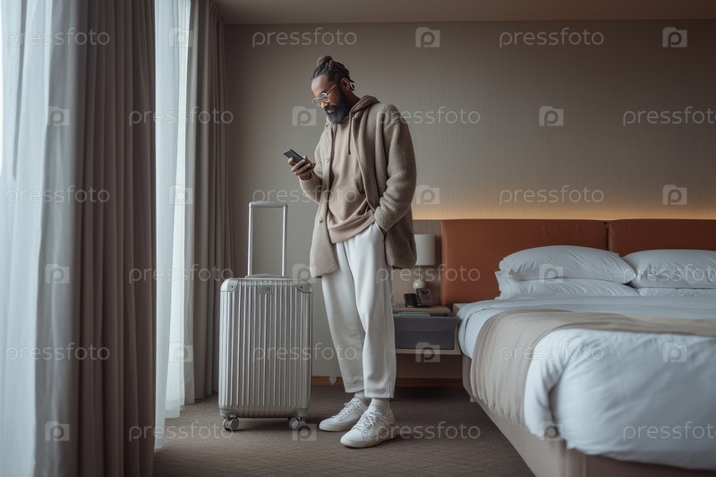 Молодой взрослый чернокожий мужчина стоит в гостиничном номере, используя смартфон возле чемодана