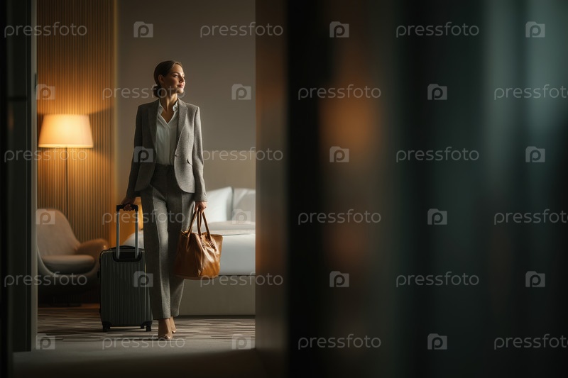 Молодая взрослая женщина входит в гостиничный номер, неся багаж и сумочку