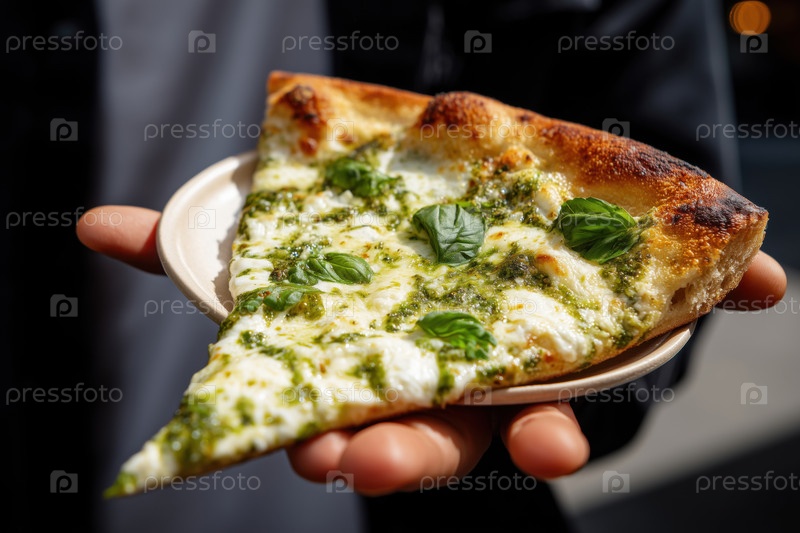 Young Adult Hand Holding Plate Serving Slice of Pesto Pizza Молодой взрослый держащий в руках тарелку, подающую кусочек песто-пиццы