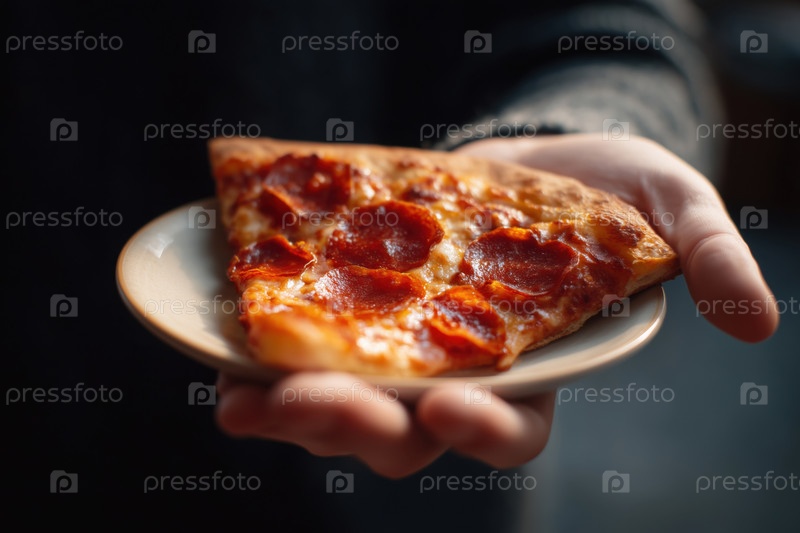 Молодой взрослый мужчина держит тарелку с кусочком пиццы Pepperoni в помещении