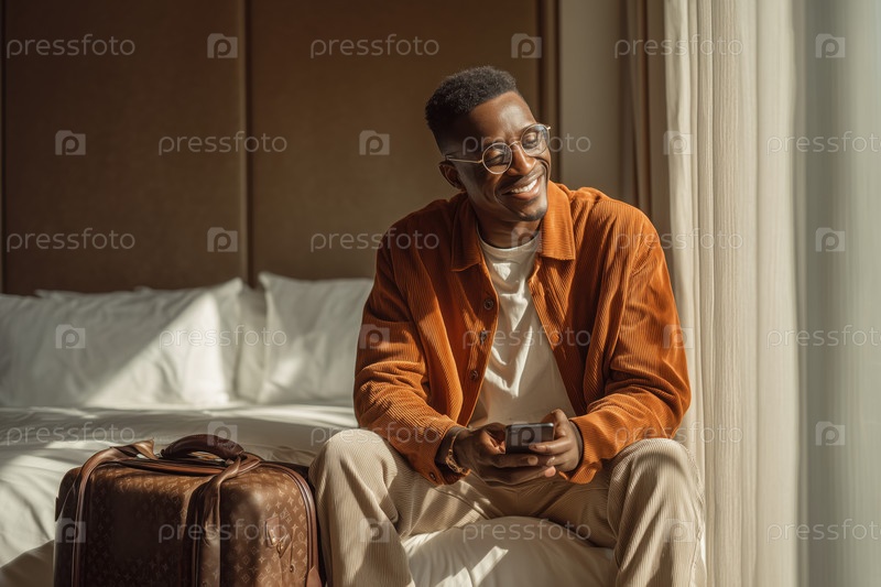 Молодой взрослый чернокожий мужчина сидит на кровати и улыбается, держа смартфон в помещении