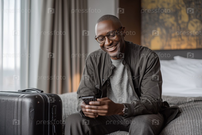 Портрет чернокожего мужчины среднего возраста, улыбающегося во время обмена текстовыми сообщениями со смартфона в помещении