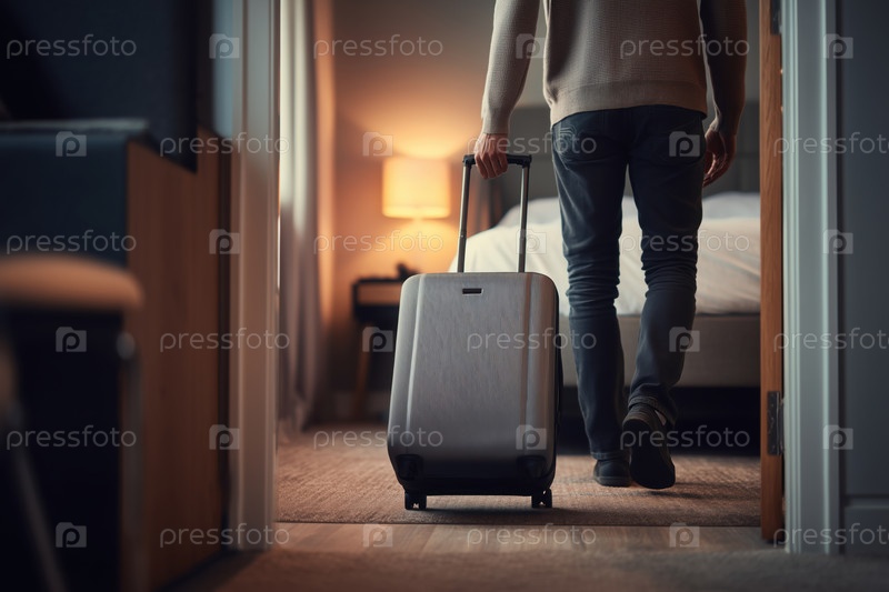 Молодой взрослый мужчина входит в гостиничный номер, неся чемодан