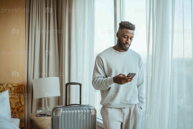Молодой взрослый чернокожий мужчина использует смартфон возле окна в гостиничном номере Traveling