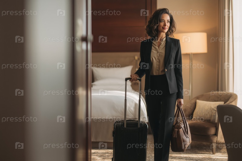 Молодая взрослая женщина входит в гостиничный номер, неся чемодан и сумочку