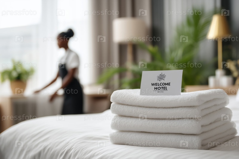 Подготовительная комната горничной с свежими полотенцами и картой приветствия отеля