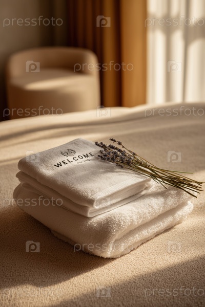 Полотенца насквозь с вышивкой 'Добро пожаловать' и лавандой, лежащей на кровати