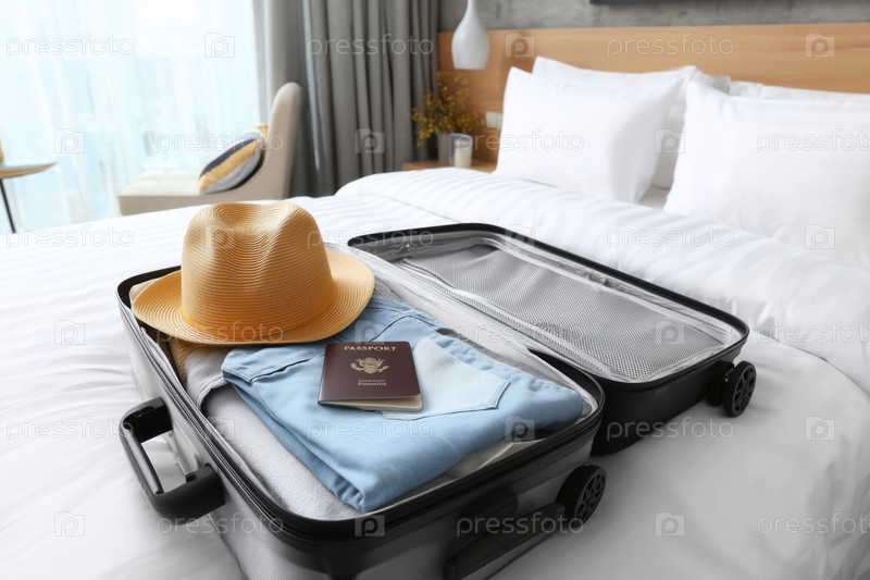 Чемодан с паспортом и открытой шляпой, отдыхающий на кровати в гостиничном номере