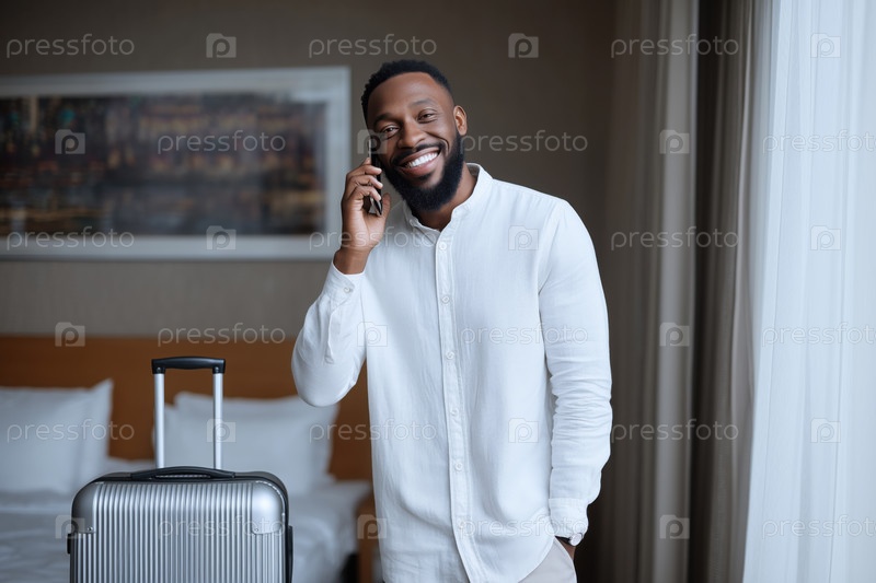 Молодой взрослый чернокожий мужчина улыбается, разговаривая со смартфоном в гостиничном номере