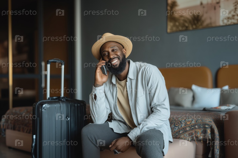 Молодой взрослый чернокожий мужчина сидит на кровати и улыбается, разговаривая со смартфоном